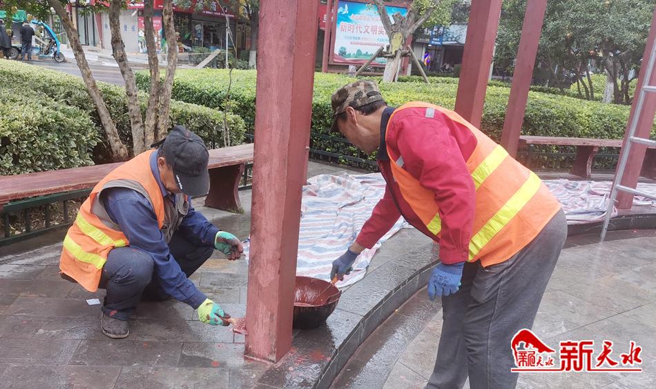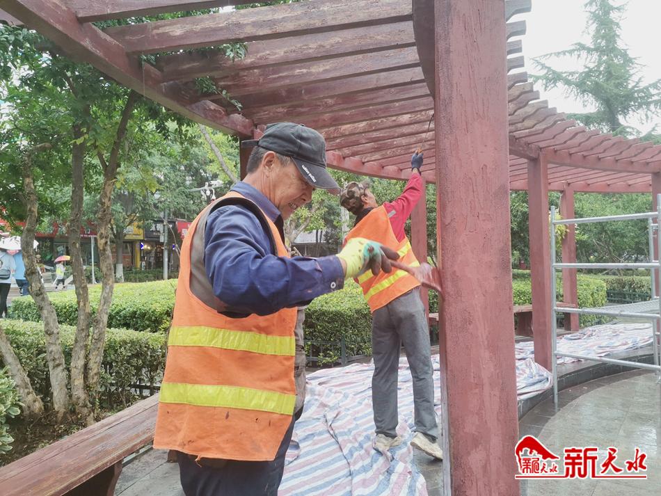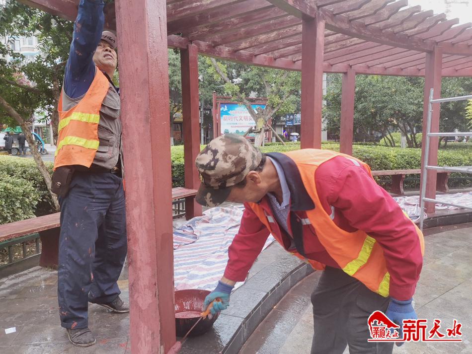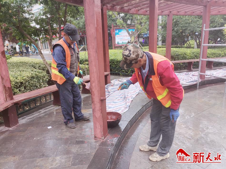 9月17日,两名工人正在给秦州区新华路的一凉亭“补妆”。连日来,市政管理部门组织油漆工人,为多处凉亭统一刷漆,为创城助力。
