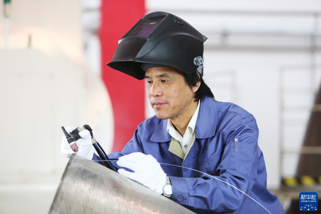 “金手天焊”高凤林在工作中(2015年4月30日摄)。他先后为90多发火箭焊接过“心脏”,攻克航天焊接200多项难关。新华社发