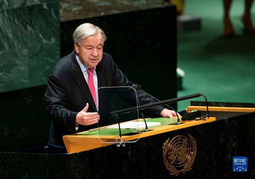 9月21日,在位于纽约的联合国总部,联合国秘书长古特雷斯在第76届联合国大会一般性辩论开幕式上致辞。新华社记者王迎摄