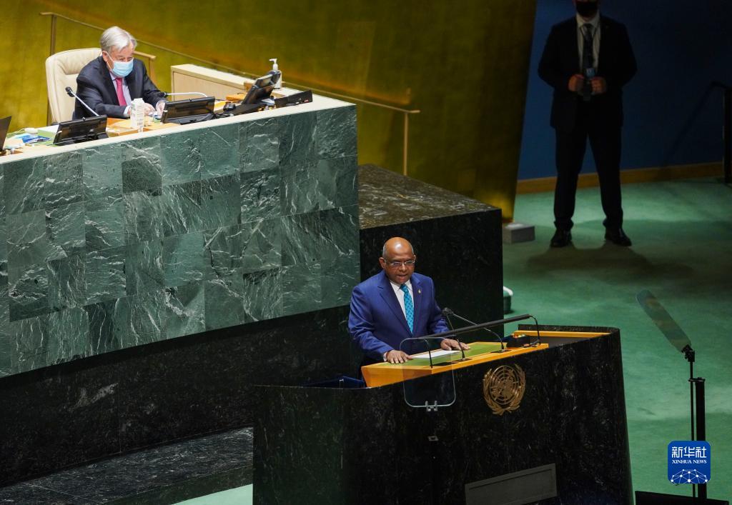 9月21日,在位于纽约的联合国总部,第76届联合国大会主席阿卜杜拉·沙希德(前)主持联合国大会一般性辩论开幕式。新华社记者王迎摄