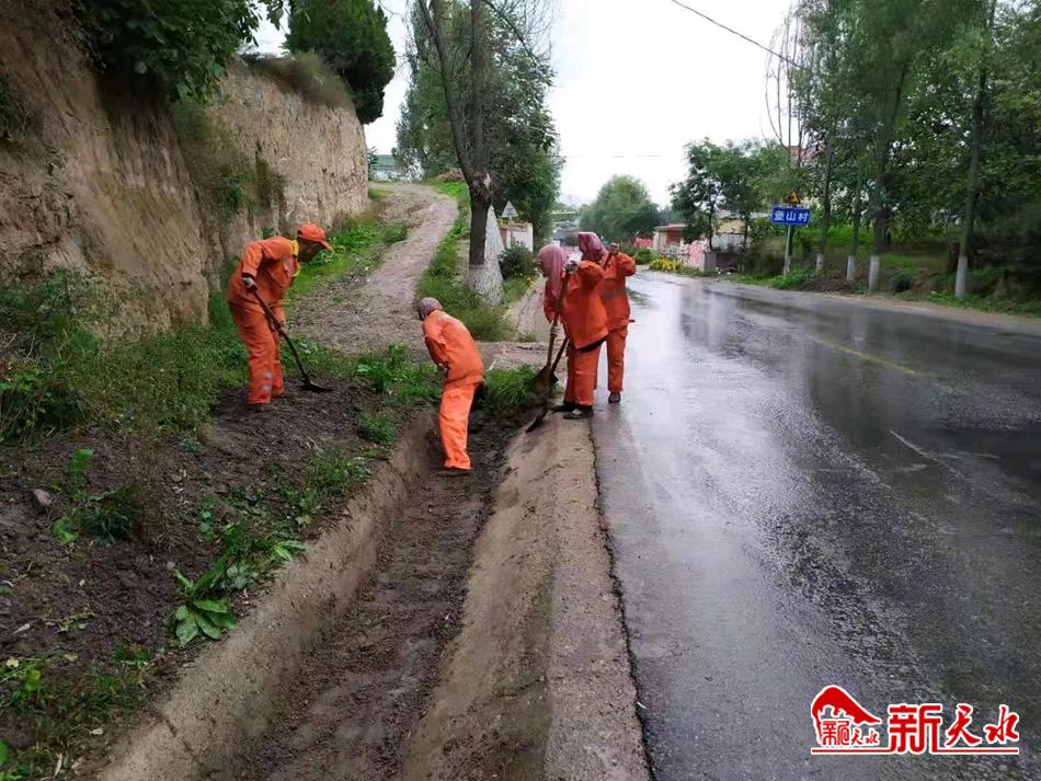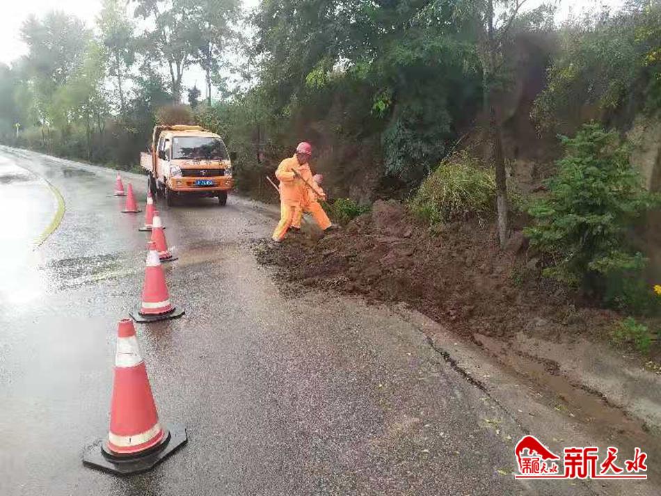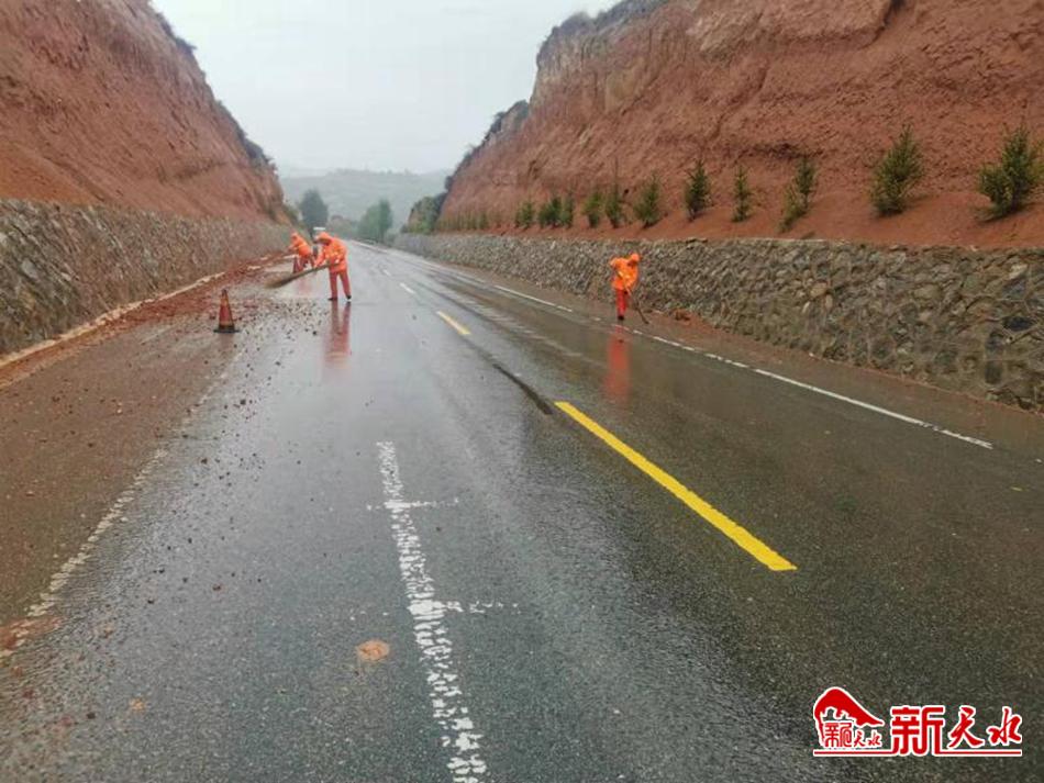 新天水讯【通讯员 王小强 张新军 】近日,连绵秋雨造成张家川县境内公路出现塌方、泥石流等隐患,给交通安全带来一定的影响,张家川公路段干部职工雨中坚守,保障公路畅通。
