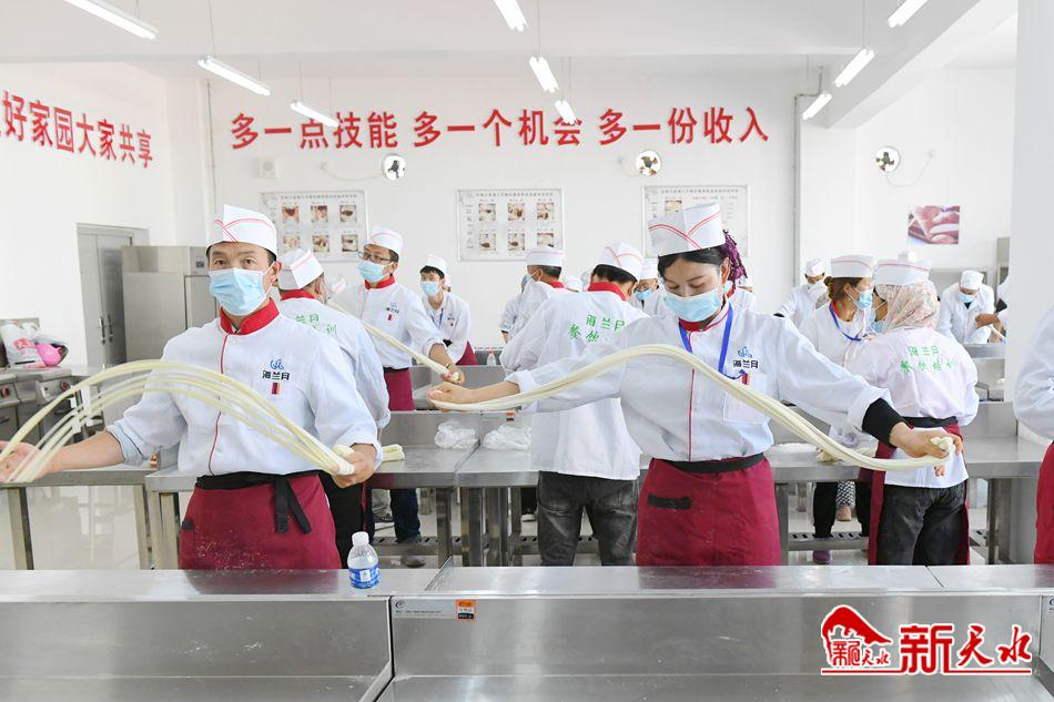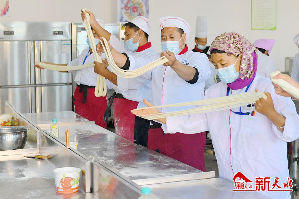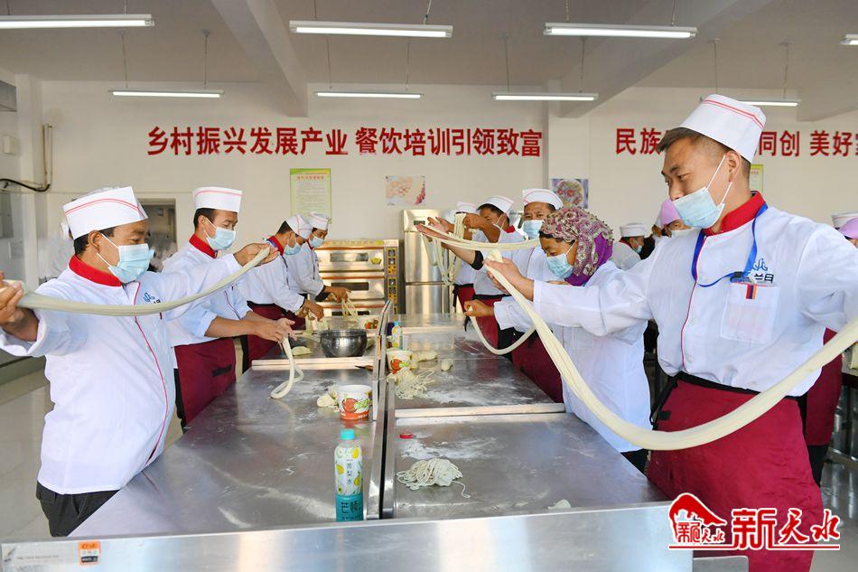 9月26日,张家川县职业技术教育中心“伊香拉面师”培训班的学员正在练习拉面技能。