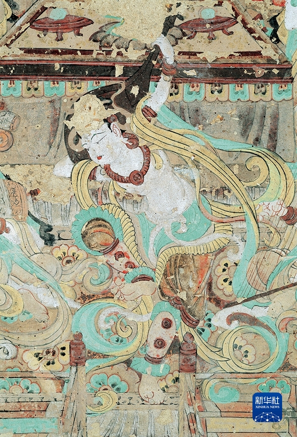 敦煌壁画中的“反弹琵琶”(资料照片)。敦煌研究院供图