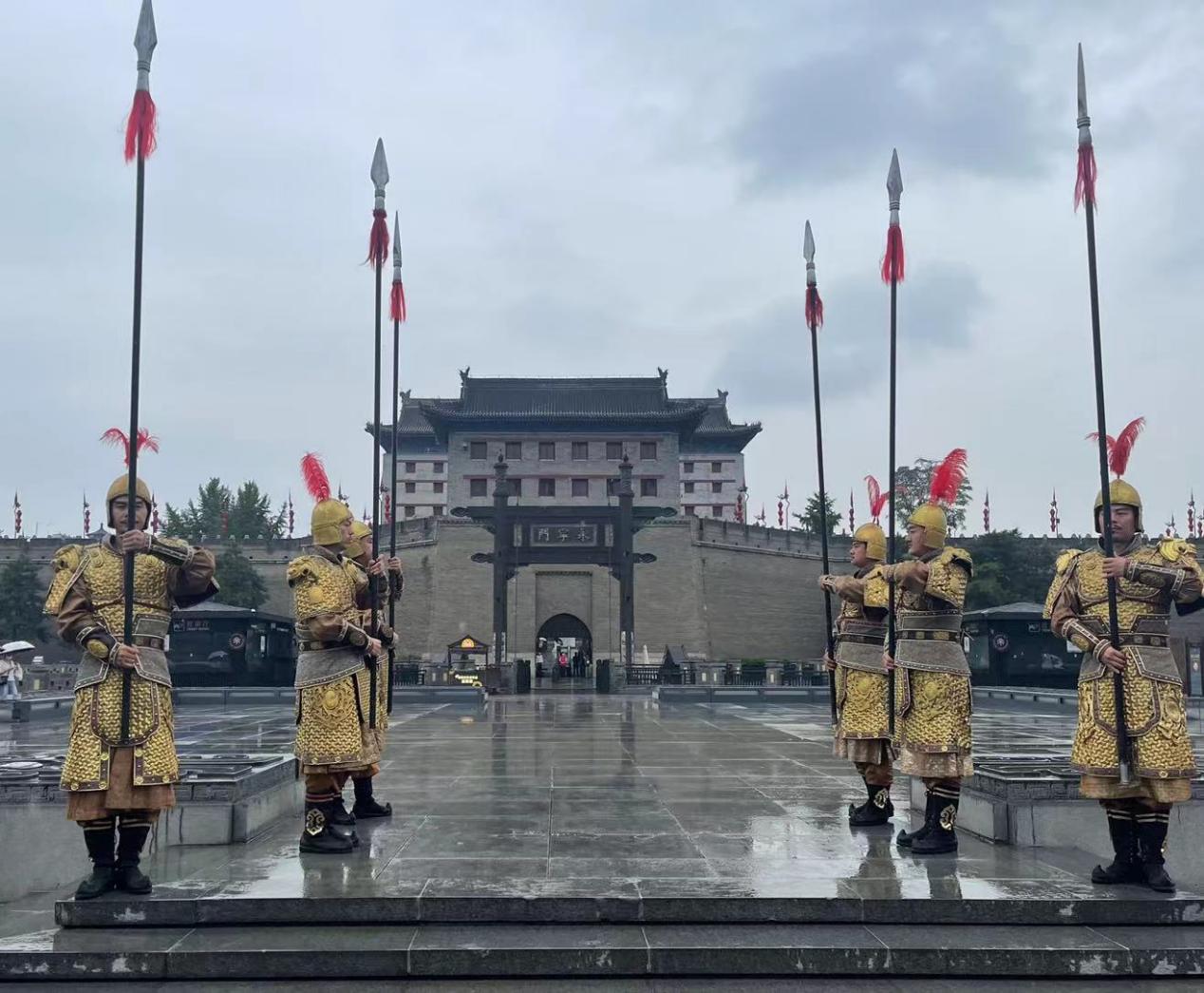 飒爽英姿的大唐羽林卫、身着唐装的少女……从永宁门走进古城墙,青山绿水间,红砖灰瓦交相呼应,蒙蒙细雨中轻轻笼罩着的雾气让人仿佛瞬间穿越,进入繁华古都。