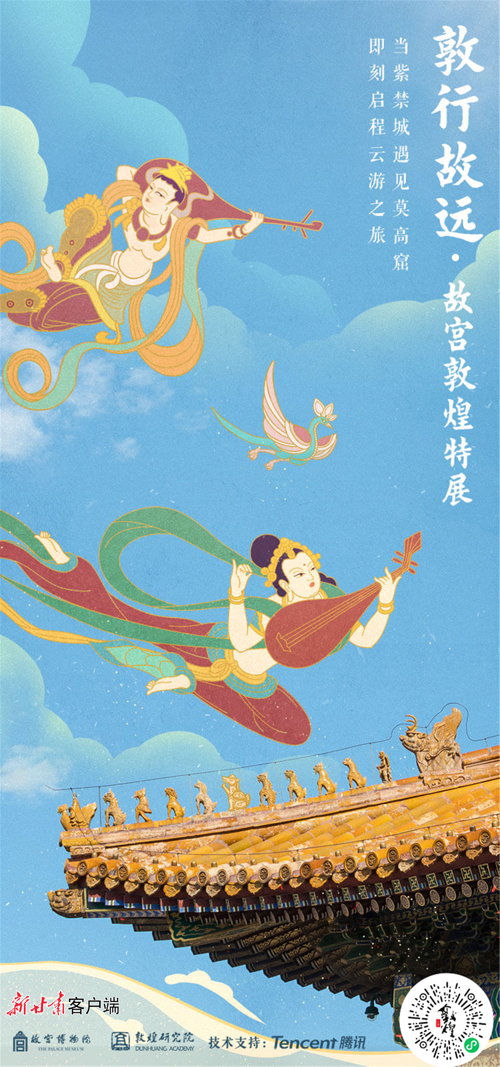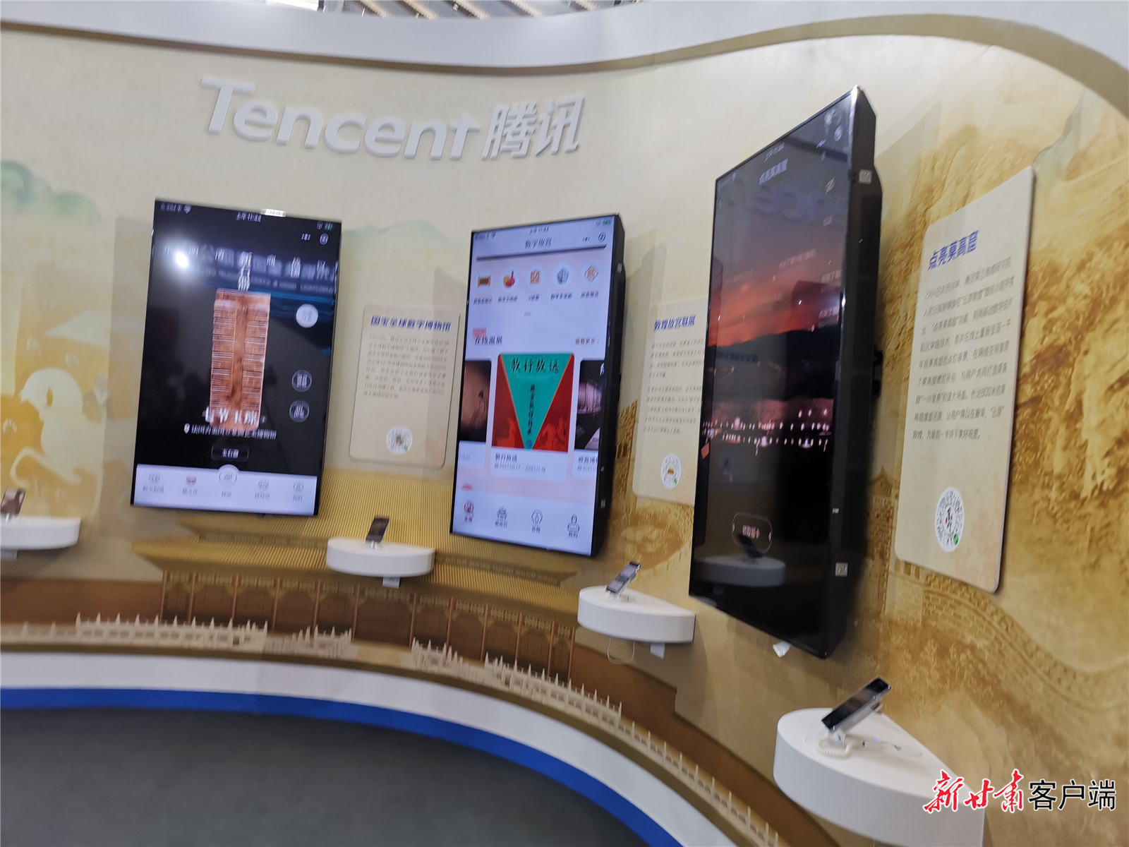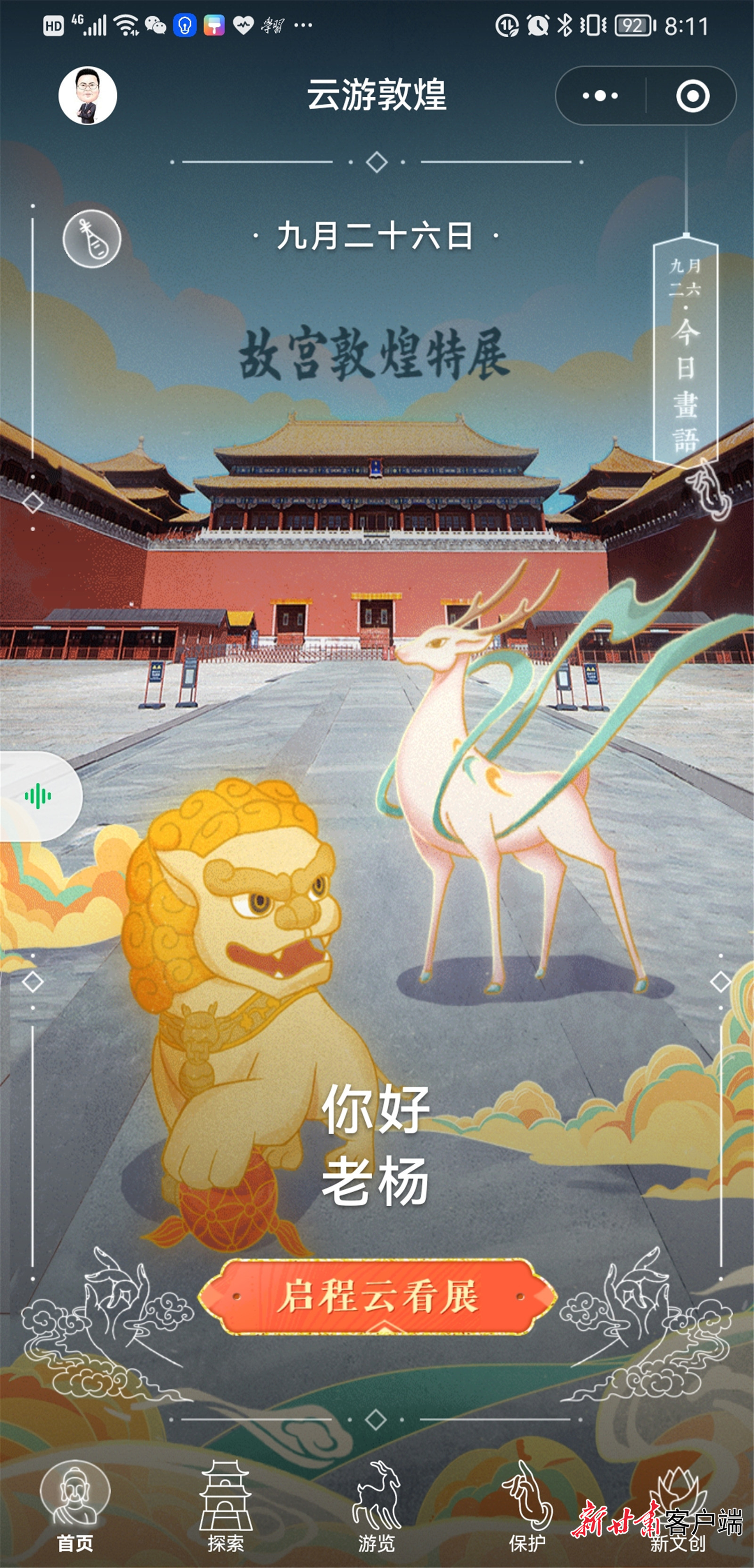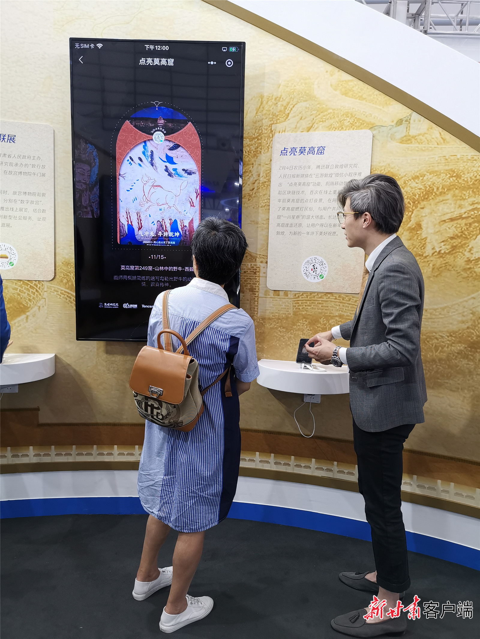 这是古老的敦煌与现代文明的又一次碰撞,在互联网企业腾讯展台,点击已联通墙上大屏幕的手机,进入“云游敦煌”小程序,首页显示出“敦行故远:故宫敦煌特展”画面。敦煌壁画里广为人知的九色鹿和故宫门前的狻猊,化身为活泼可爱的动画形象,带领游客从莫高窟标志建筑“九层楼”走到“故宫博物院”,进入线上展厅云看展。