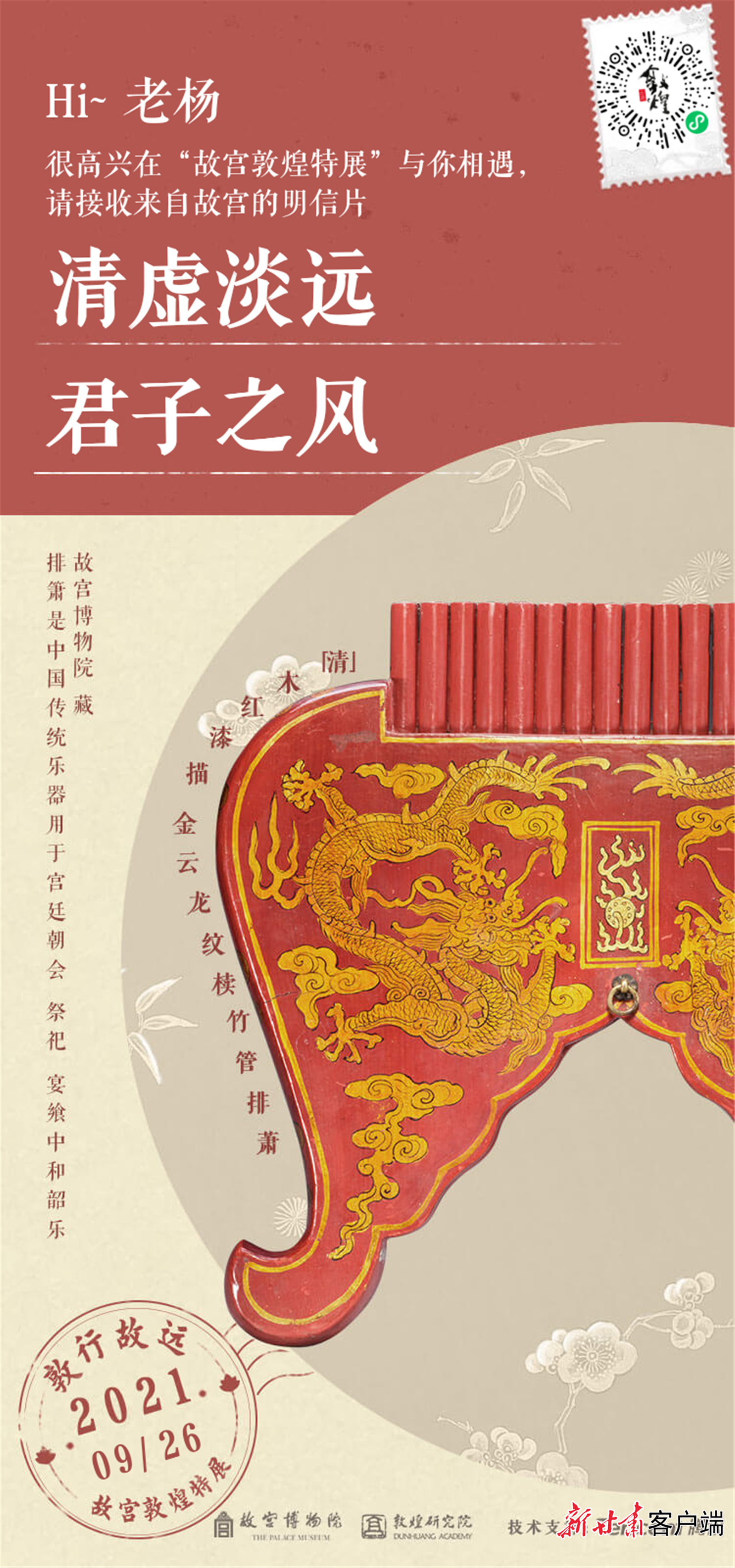 进入云展厅,游客就会收到来自故宫、写有自己网名的明信片,在九色鹿和狻猊化身的“导游”的引领下进行参观。从《胡腾舞铜俑》《都督夫人礼佛图》到《浮屠简》《莫高窟第285窟》《木黑漆描金双龙戏珠纹斗笙》,这些来自敦煌研究院、甘肃博物馆和甘肃简牍博物馆的展品,无不美轮美奂。点击展品,不仅能显示出展品的“前世今生”和所藏馆别,还会收到一份“时空来信”,订制属于自己的文物明信片。徜徉其中,就会感受到千年敦煌的盛大与辉煌。
