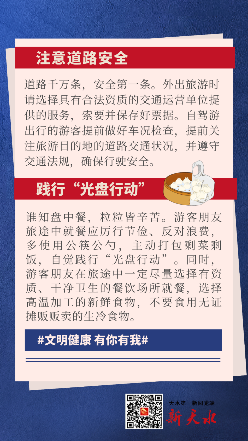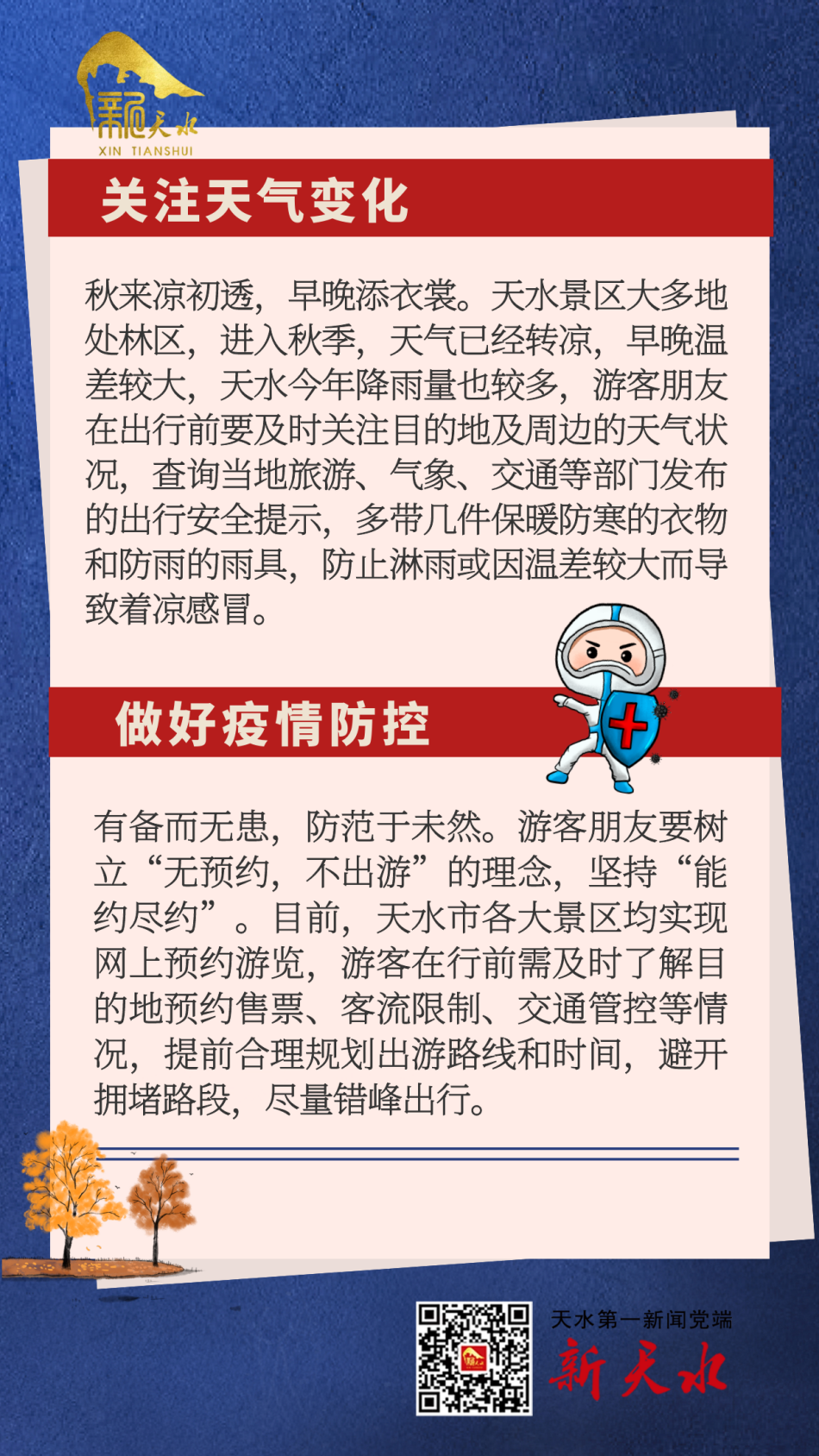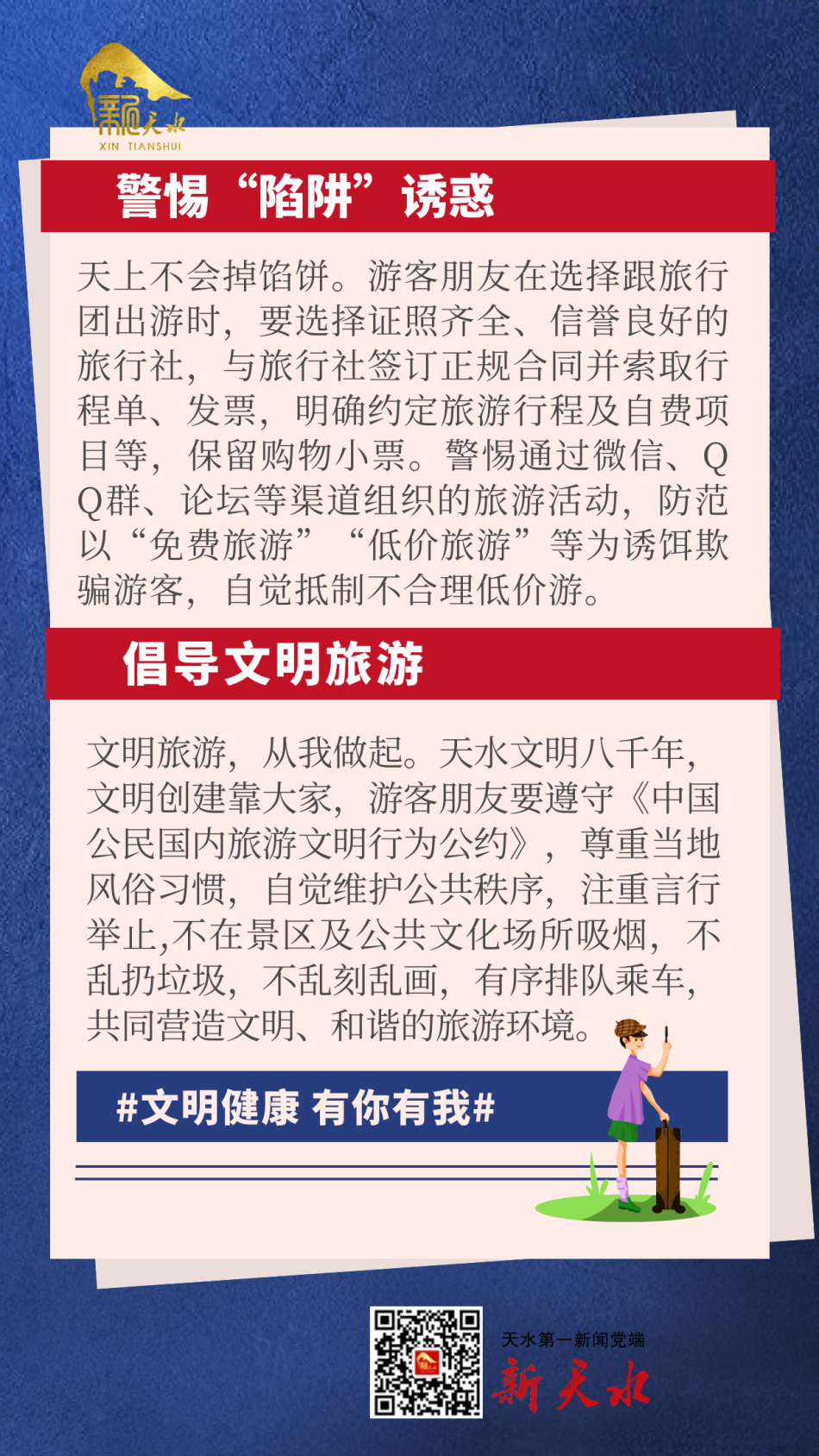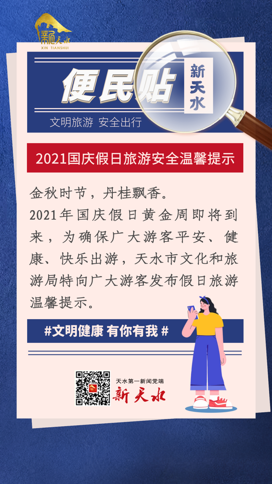 2021年国庆旅游黄金周即将到来,为了确保市民出行、出游等安全、顺畅,天水市文化和旅游局发布“2021年国庆假日旅游安全温馨提示”,广大游客朋友们总结了国庆期间旅游出行的常见问题。希望大家及时了解相关信息,以保证平安、愉快过节。