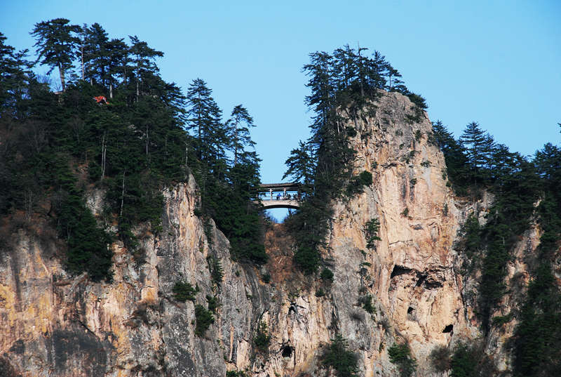 石门位于天水市麦积区东南方向50公里。其山壁立千仞,四周峭崖,只有一条小路联接南北两峰,且南北峰之间的聚仙桥下石壁上,有一大方形黑浑圈 ,状若门楣 ,故名石门山。中秋夜,皓月仿佛从石门缝中徐徐升起,变幻无穷,称之为“石门月夜”。