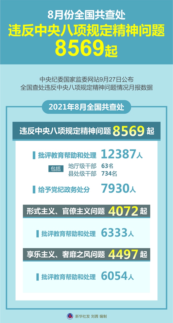 新华社北京9月27日电(记者孙少龙)中央纪委国家监委网站27日公布全国查处违反中央八项规定精神问题情况月报数据。通报显示,2021年8月,全国共查处违反中央八项规定精神问题8569起,批评教育帮助和处理12387人(包括63名地厅级干部、734名县处级干部),给予党纪政务处分7930人。