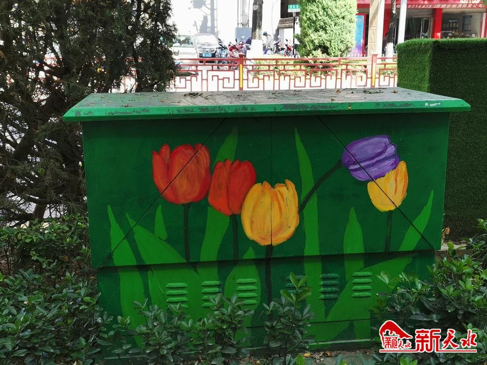 9月27日,记者来到青年南路、民主路,只见在路两边的配电箱穿上了彩色“外衣”,花朵、绿树……这些彩绘与周边的绿化融为一体,十分别致,画面清新有趣。