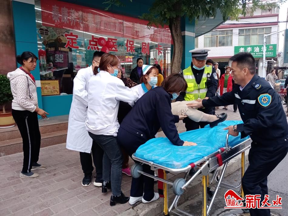新天水讯 【记者余碧波】 9月30日早上10时30分,张家川县公安局交警大队城区中队民警马旭、马芸芸巡逻到公园路执勤时,发现有群众在路面围观影响交通,于是上前查看,原来一名中年女性走路时突然晕倒在地不省人事,双眼紧闭,面色煞白,额头满是汗珠,双手紧紧抱着胸口,表情痛苦。