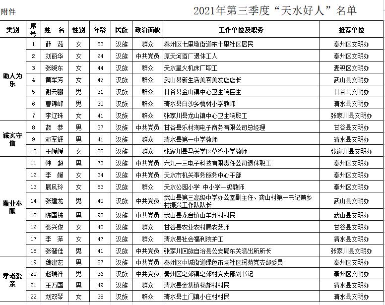 新天水讯 “天水好人”的评选由市文明办牵头,每季度评选一次。2021年第三季度,按照市文明办《关于组织开展“天水好人”推荐评选活动的通知》,各县区共推荐“助人为乐”“诚实守信”“敬业奉献”“孝老爱亲”四个类别“天水好人”候选人40人。市文明办邀请市委宣传部、市委直属机关工委、市总工会、团市委、市妇联、天水日报社、天水广播电视台等单位相关负责人组成评审委员会,于2021年9月29日召开会议进行了认真评审,确定薛茹等22人为2021年第三季度“天水好人”(名单见附件)。