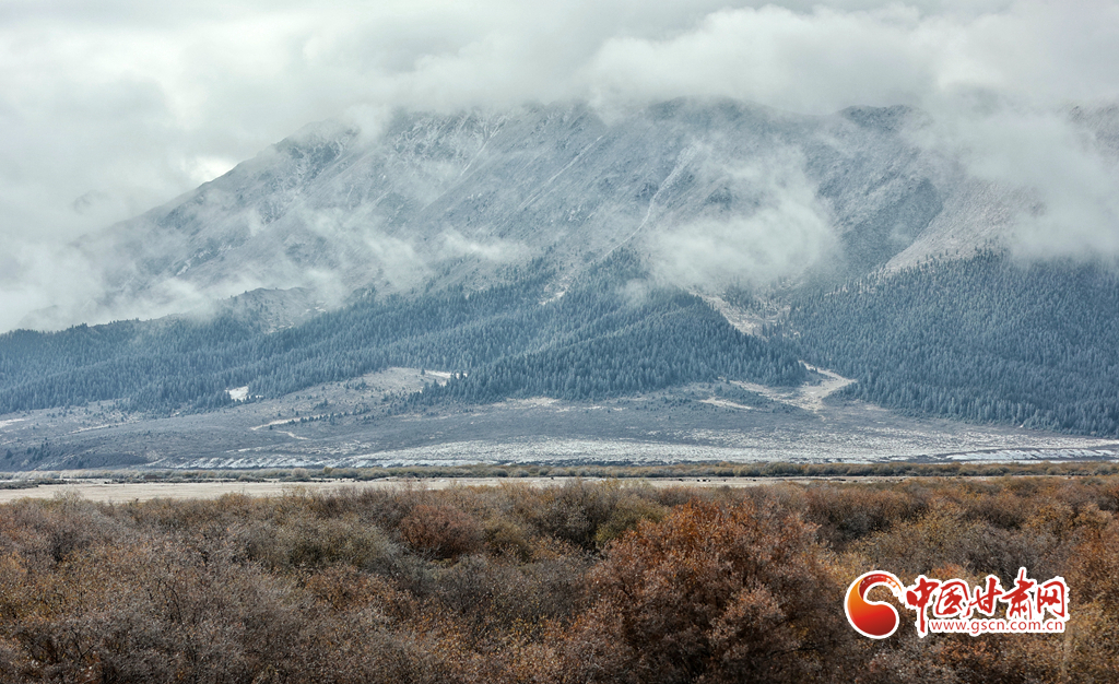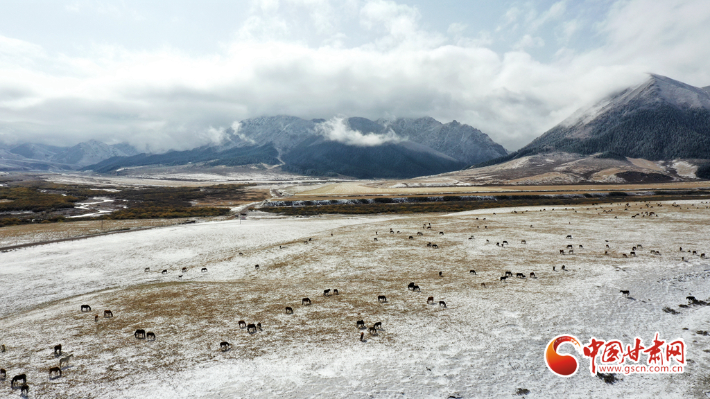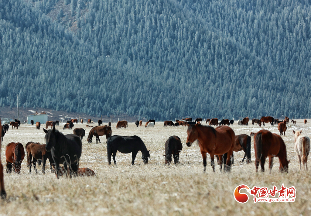 10月9日,受冷空气影响,位于甘肃省河西走廊中部的山丹马场迎来降雪天气,马群在雪原上奔跑觅食,一派北国风光。