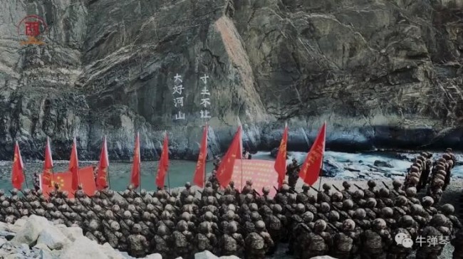 当时的冲突,就在“大好河山、寸土不让”8个大字之下,这不也更说明,去年的冲突,完全是印军越界,蓄意挑衅。