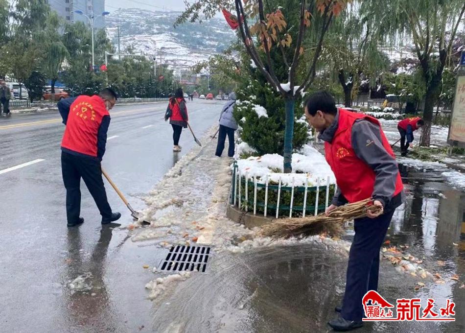 新天水讯 10月10日,张家川县发改局组织志愿服务队上街清理积雪,确保群众出行安全。