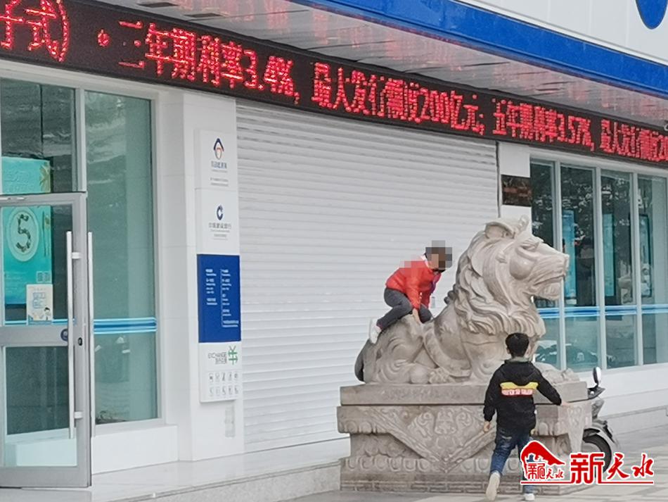 10月10日,在龙城广场某银行门前,一孩子爬上狮子雕塑玩耍,不仅存在安全隐患,也可能对设施造成破坏。 夏雨 摄