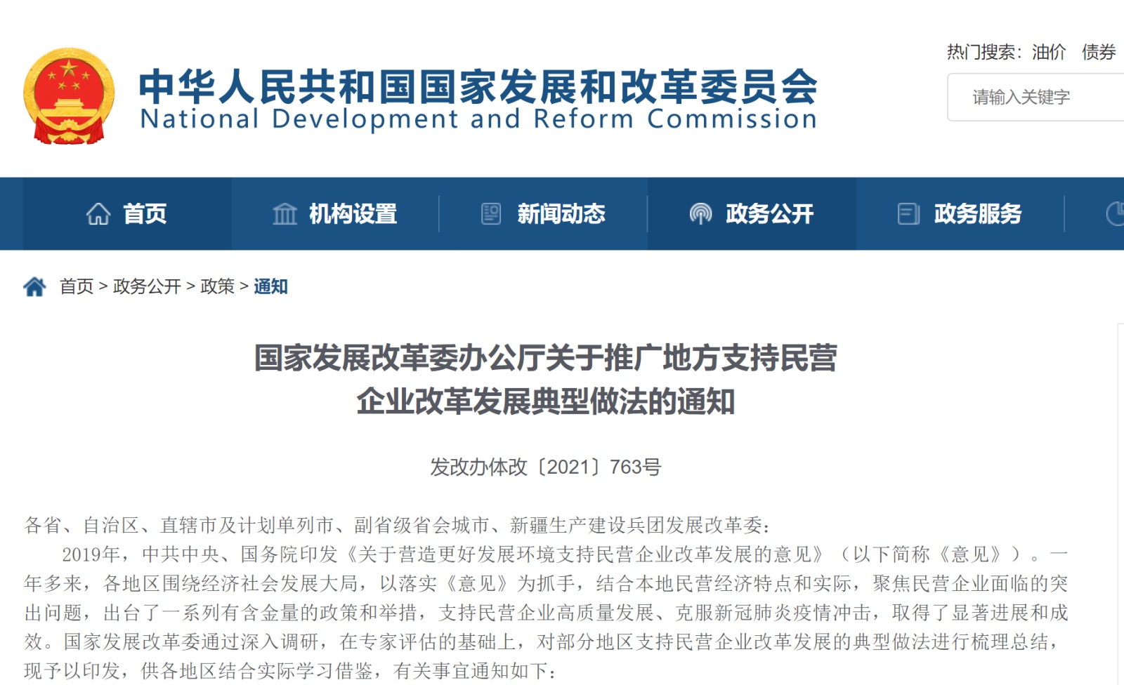 央广网北京10月11日消息(记者 张圣琪)11日,国家发改委发布《关于推广地方支持民营企业改革发展典型做法的通知》。