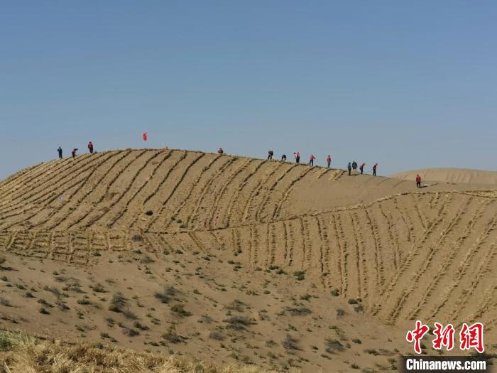 凉州区林业和草原局党组书记、局长陆科接受中新网记者采访时说,按照相关标准,每个草方格两米见方,此后再在这些方格里种上梭梭和沙拐枣等沙生苗木,且要按“品”字栽种,以保持水分增大沙生植物的成活率,起到防风固沙的作用。