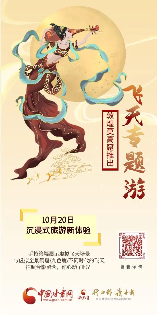 10月20日,敦煌莫高窟将推出“飞天”专题游览线路,为游客提供虚拟现实+亲身体验的全新感受,游客可以在虚实融合的特殊场景中,与飘逸灵动的飞天、栩栩如生的九色鹿、沉浸式全景洞窟、若隐若现的大佛等经典形象合影留念。值得注意的是,游客须提前一周在莫高窟参观预约网预约。