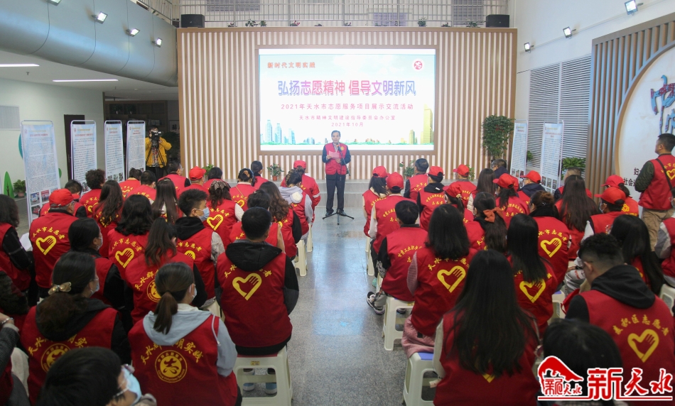 新天水讯【见习记者 王琴】10月13日,由天水市文明办主办的“弘扬志愿精神 倡导文明新风”2021年天水市志愿服务项目展示交流会举行。来自全市13个优秀志愿服务组织以及参与展示交流的优秀志愿者、项目代表,共计80余人参加了交流活动。