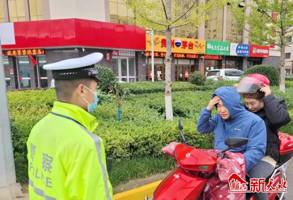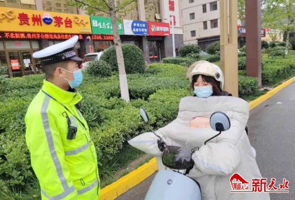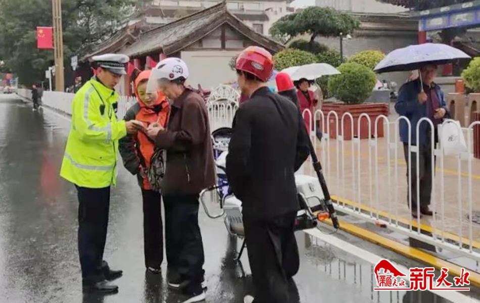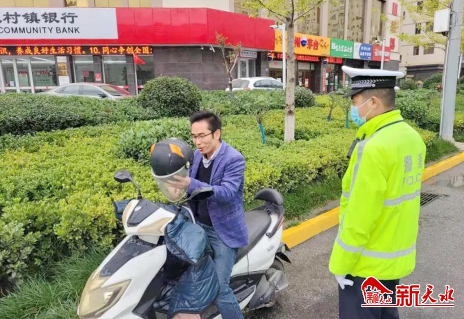 10月13日上午,秦州公安分局城区交警大队民警在民主路执勤,对骑电动自行车驾乘人员未戴头盔的行为进行劝导。