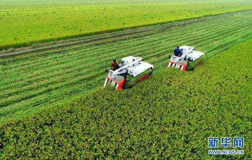 安徽省合肥市庐江县白湖镇现代农业示范基地晚稻全面开镰收割。新华网发(王闽 摄)
