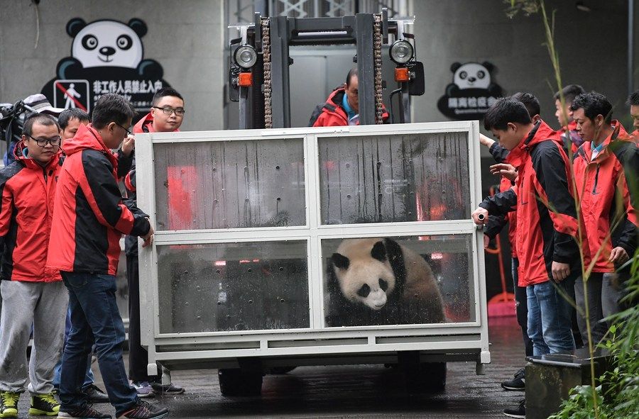 4月29日,在中国大熊猫保护研究中心雅安碧峰峡基地,工作人员将大熊猫“丁丁”运往运输车。新华社记者薛玉斌摄