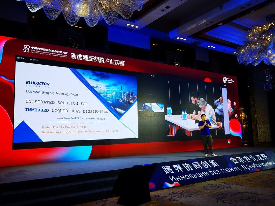2021年7月22日,在中俄青年创新创业与创意大赛新能源新材料产业决赛上,中方参赛项目代表在介绍项目,俄方评委在线上评审。新华社记者房俊伟摄