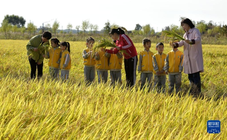 10月16日,河北省临城县县直幼儿园的孩子在老师带领下参观稻田。