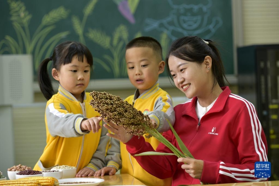 10月16日,河北省临城县县直幼儿园的孩子在老师指导下认识粮食作物,学习粮食知识。