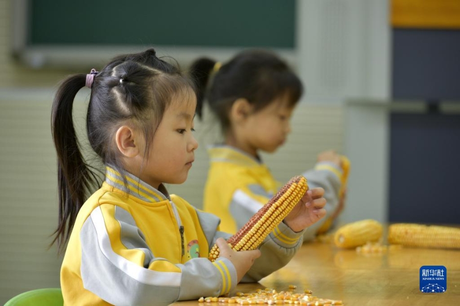 10月16日,河北省临城县县直幼儿园的孩子参加剥玉米粒比赛。