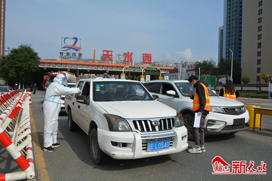 随后,记者一行去往秦州区西十里的天水西高速公路出入口,记者看到,有上百辆进入市区的车辆在排队缓慢前行,交警、特警、医务人员等正在挨个对车内人员进行测量、检查、登记。
