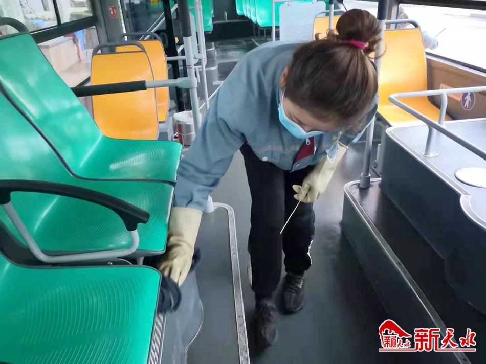 10月21日,记者在秦州公交站看到,作为1路、6路等公交车的首末站,等乘客全部下车后,站务人员便拿着笤帚、拖把、喷壶等打扫车厢内外,擦洗车体、玻璃、座椅、扶手、拉环,清扫垃圾、地面,最后喷洒消毒液,对车厢内部进行消杀。