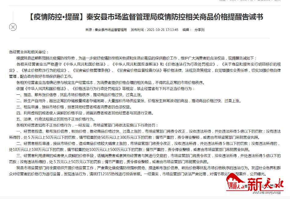 新天水讯【通讯员 王顺芳】10月20日,秦安县市场监管局向全县经营主体和相关单位发布《疫情防控相关商品价格提醒告诫书》,进一步做好疫情防控相关物资和生活必需品的保供稳价工作,维护广大消费者的合法权益。