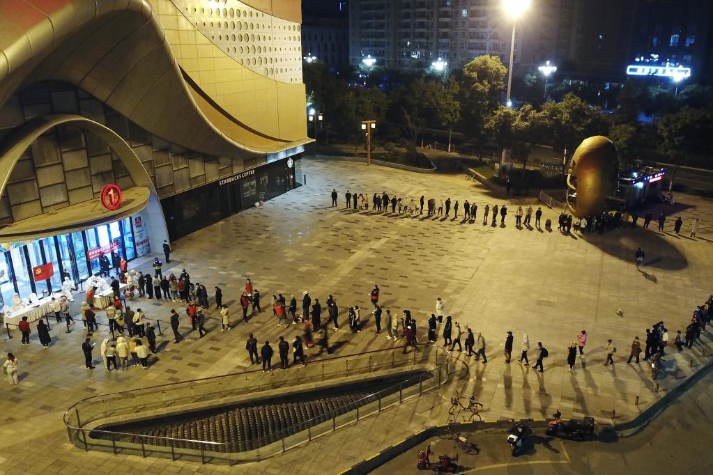 10月21日凌晨,在兰州市城关区天水路一核酸检测采样点,市民有序排队等待。(无人机照片) 新华社记者范培珅 摄