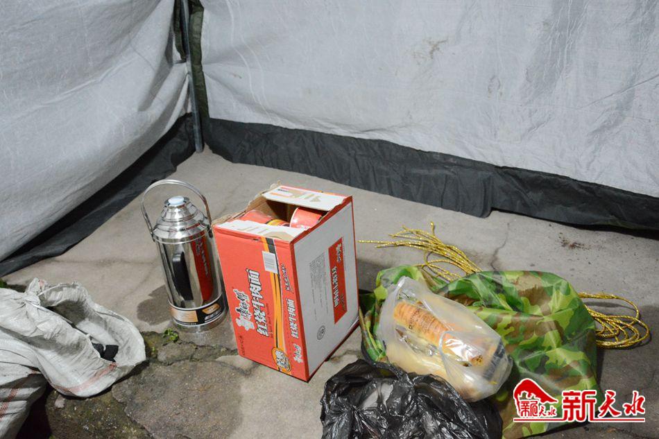 说是炉子,其实就是一个很旧的铁皮筒。“这是一户居民提供给我们的,还给我们送来了煤和柴。”秦州区财政局干部县正龙和其他3名同事是这个防控点今晚值守的志愿者。他说,虽然左家场居民楼属“三无小区”,但为了共抗疫情,大家都愿意出力,也很配合。值守点的帐篷是当天临时搭建的,条件很简陋,除了一张桌子,几个社区提供的塑料板凳,不大的空间里最显眼的就属一箱方便面和几袋咸菜了。“明天一早我们先把党旗挂起来,其他缺的东西我们慢慢置办。”县正龙一边捅着还在冒烟的炉子,一边乐观地说。