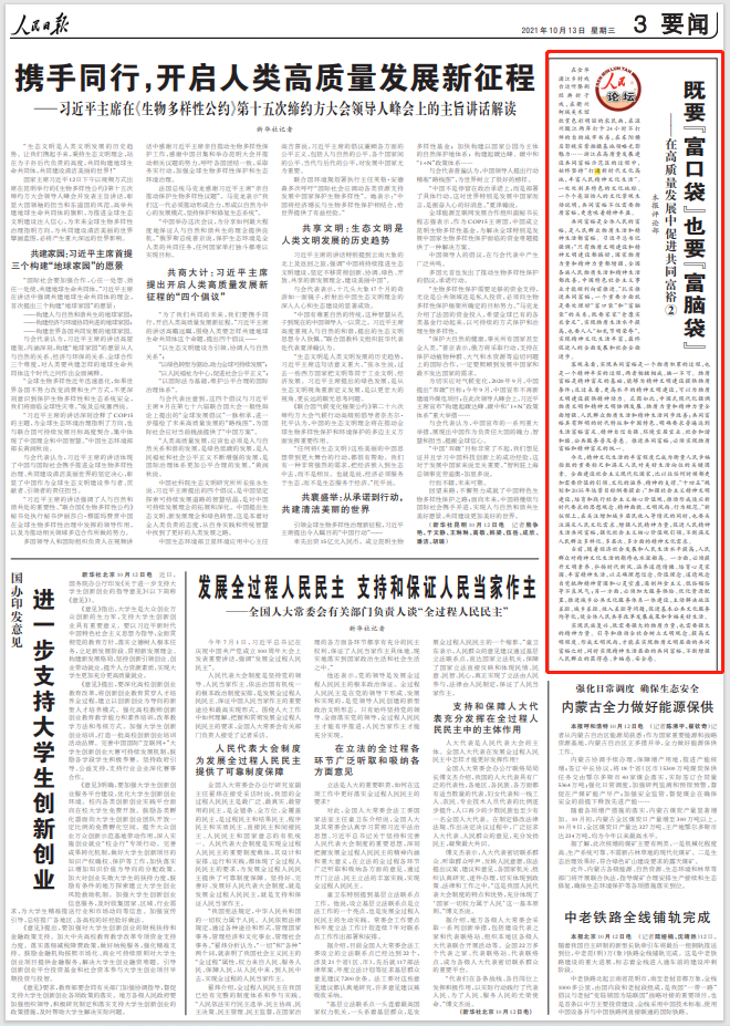 扎实推进共同富裕,一个重要方面就是要处理好“富口袋”和“富脑袋”的关系,既要家家“仓廪实衣食足”,实现物质生活水平提高,也要人人“知礼节明荣辱”,实现精神文化生活丰富,最终促进人的全面发展和社会全面进步。