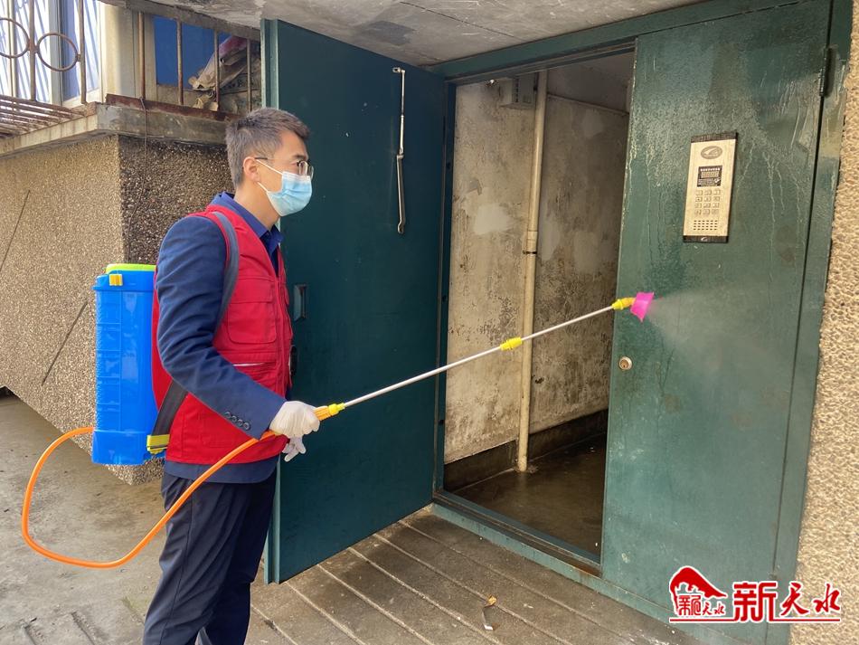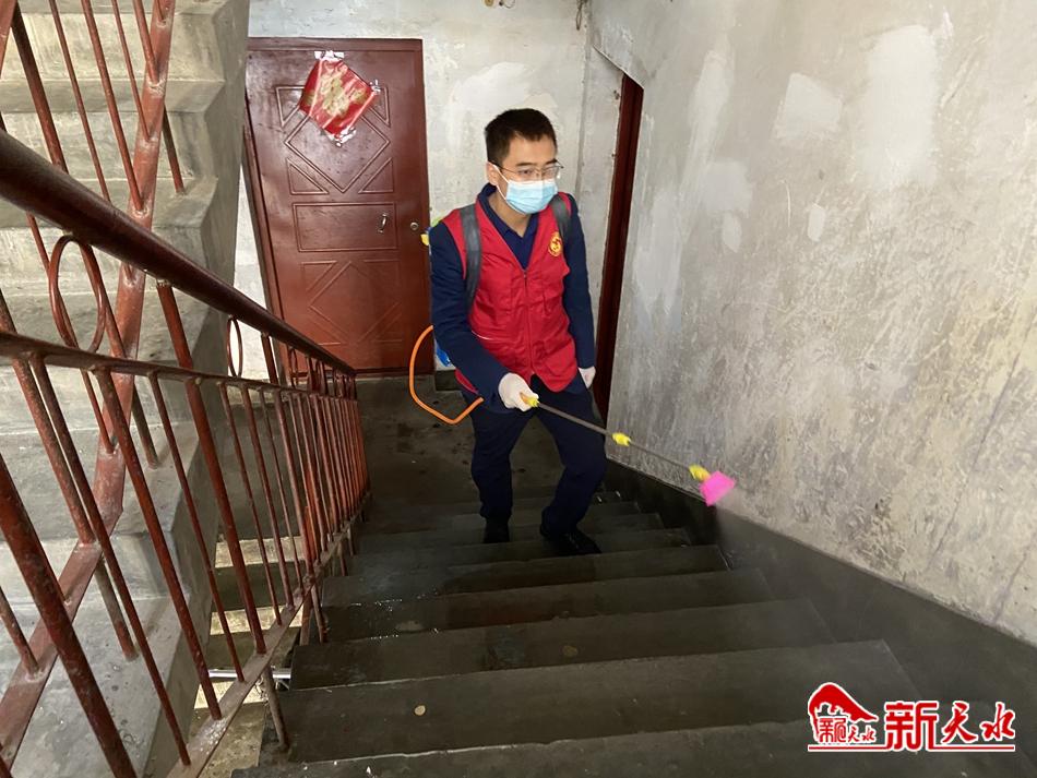 上午8时,寒意正浓,刚换班的志愿者汪永斌搓搓手,背起装着满满一桶消毒液的喷雾器,开始对小区进行当天的第一轮消毒。老旧居民楼里没有电梯,汪永斌挨着一层楼一层楼地爬上去,除了做好地面消毒,还要做好楼梯扶手消毒,而放在小区一侧的垃圾桶也是他们清理的重点。