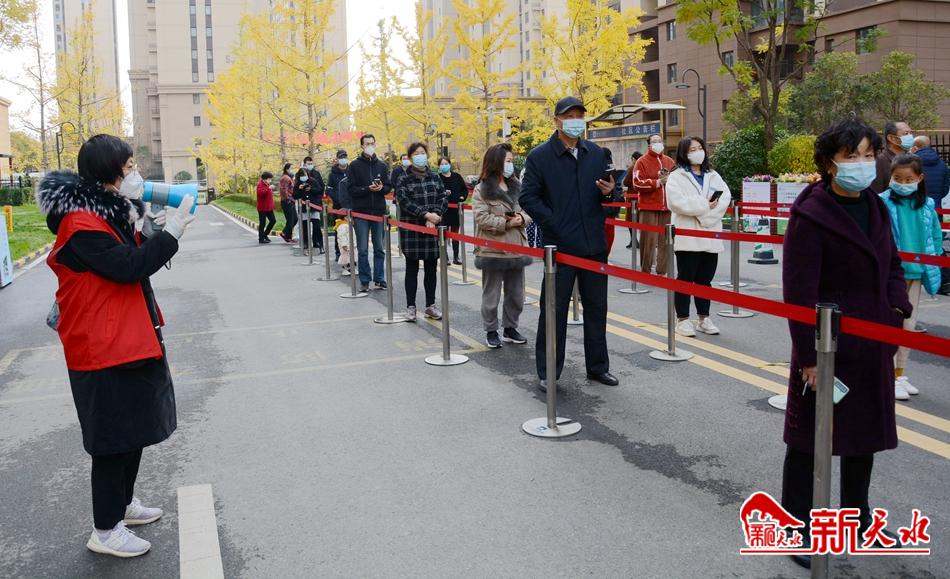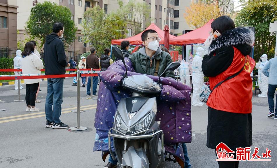 “请做完核酸检测的居民,赶快回家,不要在外面逗留。”11月2日上午10时许,在天水碧桂园小区里核酸检测采样点上,身穿红马甲的80后社区干部裴洁拿着小喇叭喊话,劝停留在现场的居民赶紧回家。“这位同志请再往后面退一点,和前面的人保持一米的距离。”在不远处,裴洁的爱人孔卓忙着协助医护人员维持着采样点的秩序。