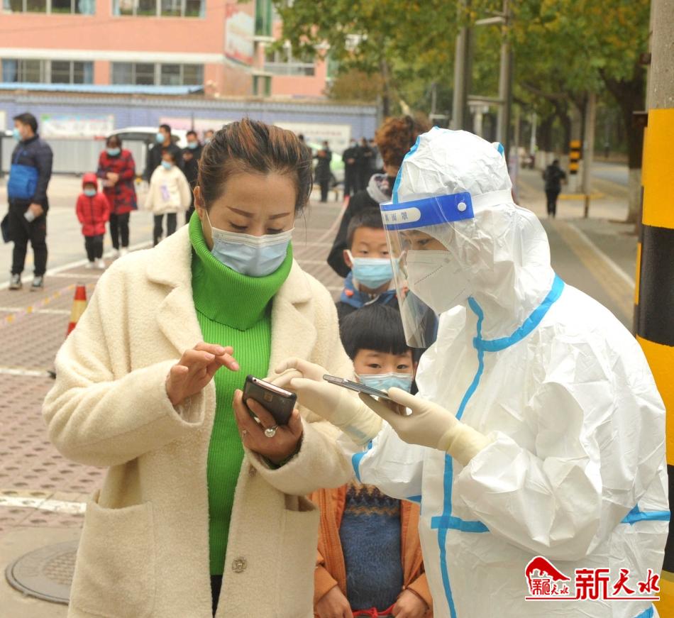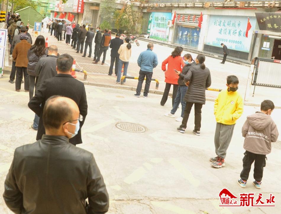 11月4日上午,位于市房地产产权交易中心门口的东关街道忠武巷社区核酸采样点,医务人员正在给群众进行核酸检测采样。从当日上午8时开始,秦州区开展第六轮大规模核酸检测,在七个街道及玉泉镇的123个核酸检测采样点上展开核酸检测采样。 新天水记者 杨晓斌 摄