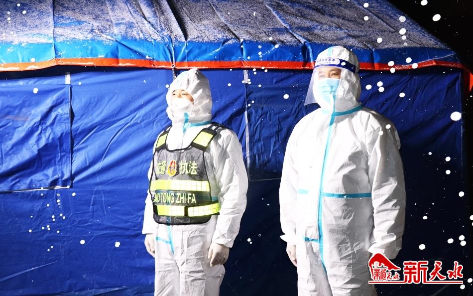 11月6日,天水市迎来了降雪天气,气温骤降、道路湿滑。风雪严寒中,秦安县公安民辅警彻夜坚守在疫情一线,各防控阵地岿然不动,恶劣的天气丝毫没有影响民辅警打赢疫情防控阻击战的决心,在高速路口、国道、高铁站、社区村口等地坚守着,对进出车辆、人员进行逐一检查、测量体温,做好登记,一遍遍的举手示意让车辆停靠,一声声叮嘱车辆小心慢行,全力以赴守护平安、筑牢安全防线。新天水记者 张彬霞 摄