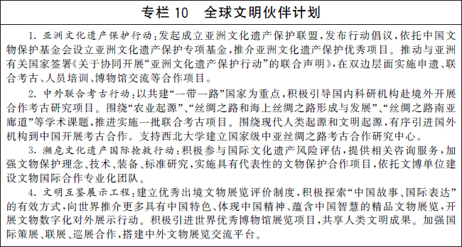 编制并实施“十四五”考古工作专项规划。系统确定考古发掘重点,深化中华文明探源工程,推进“考古中国”重大项目,科学阐释中国境内人类起源、文明起源、中华文明形成、统一多民族国家建立和发展、中华文明在世界文明史中的重要地位等关键问题,揭示中华文明的历史文化价值和核心特质。
