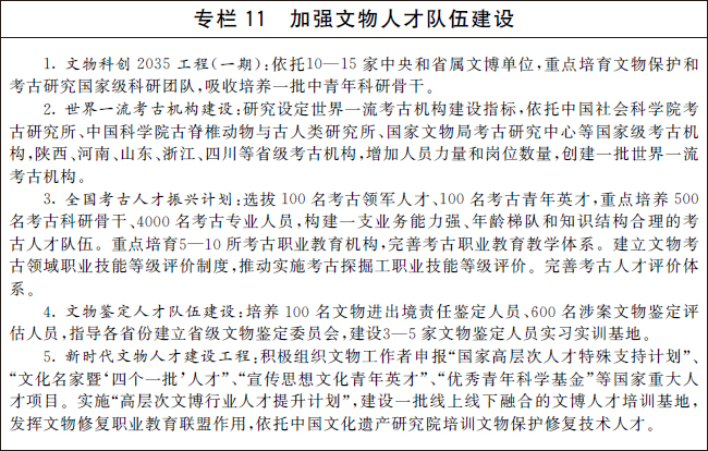 培育一批以领军人才和中青年骨干创新人才为重点的高层次文物人才,加强考古、科技创新、文物鉴定、文物修复、文物展览等急需领域人才培养,加快建设一支门类齐全、技艺精湛的文物技能人才队伍,稳步造就一支科技研发能力和技术应用能力过硬的文物科技人才队伍,锤炼一支熟悉专业、素质优良的文物管理人才队伍。加强相关行业文物保护人才培养。