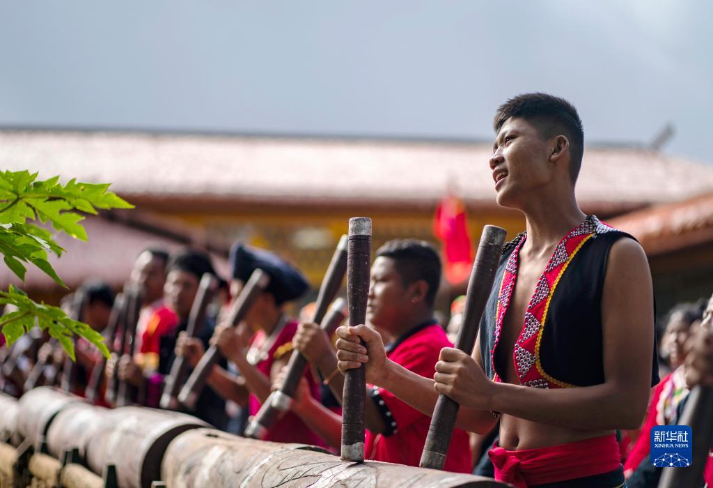 云南省沧源佤族自治县班洪乡班洪村的佤族群众身穿节日盛装,敲响佤族木鼓(8月20日摄)。新华社记者 江文耀 摄