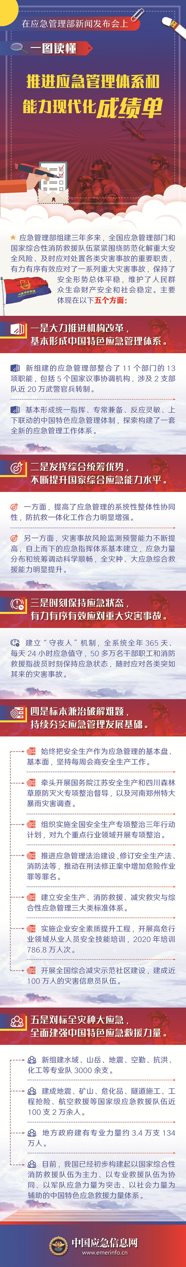 一是大力推进机构改革,基本形成中国特色应急管理体系。新组建的应急管理部整合了11个部门的13项职能,包括5个国家议事协调机构,涉及2支部队近20万武警官兵转制。期间,还组建国家矿山安监局,加强危化品监管机构和力量建设,深化应急管理综合行政执法改革和消防执法改革,完善防汛抗旱、森林草原防灭火等体制机制,探索构建了一套全新的应急管理工作体系。