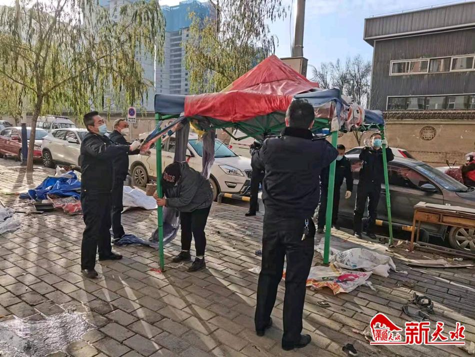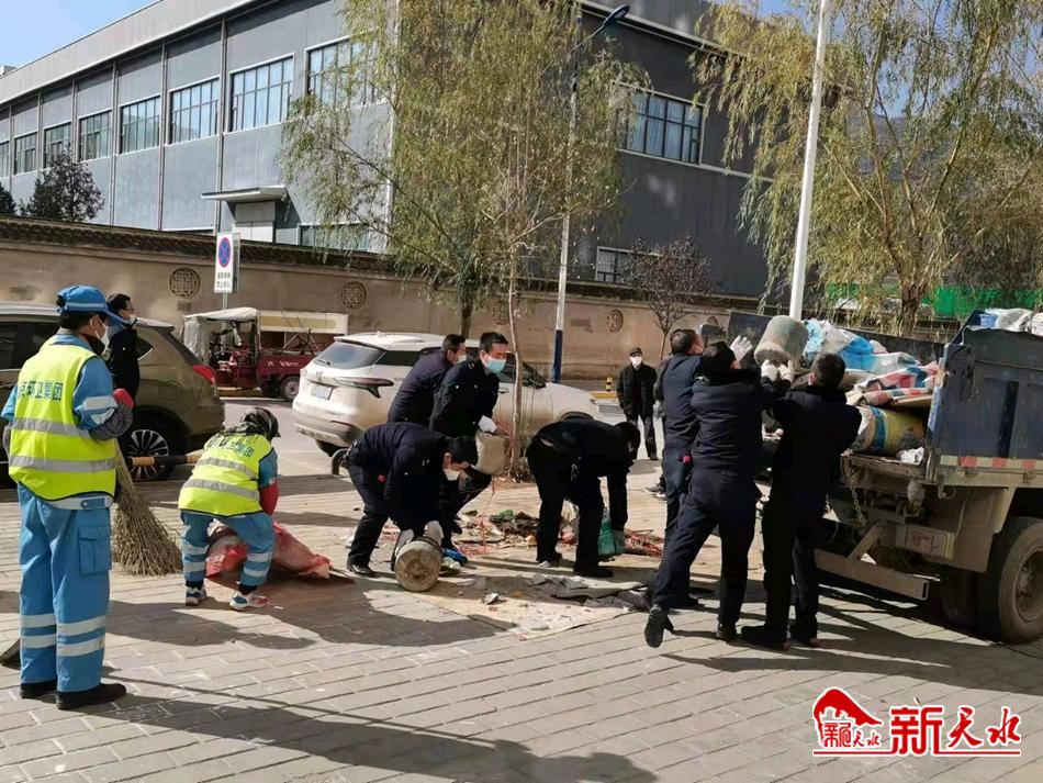 秦州区执法局天水郡中队取缔锦绣苑南门巷道临时市场