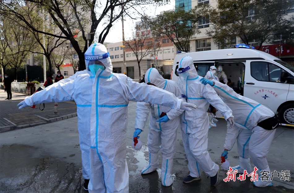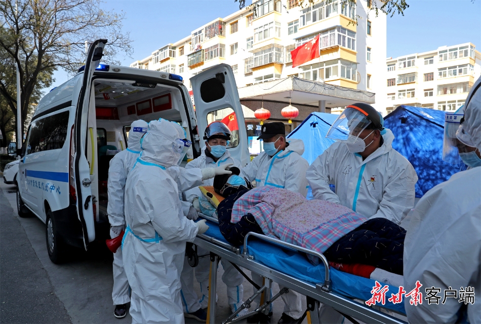 11月9日,天水市秦州区西关街道永庆路社区封控小区永红家园门口,市第一人民医院急诊科的医护人员和小区工作人员把一名急需入院治疗的老人送上了救护车。