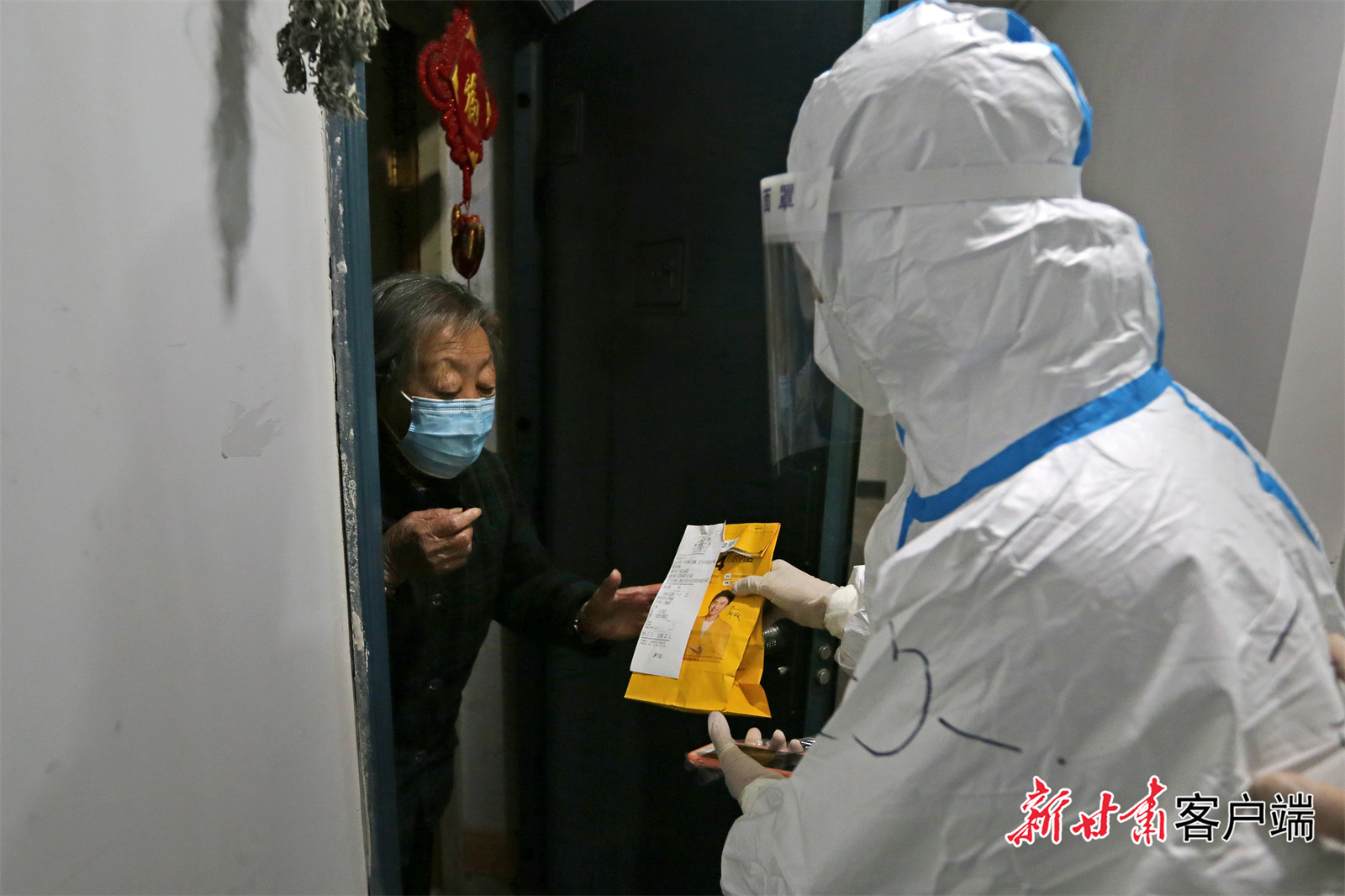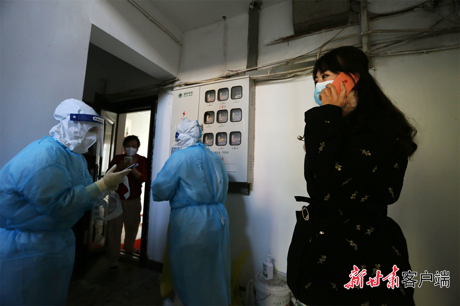 张瑜和工作人员为红码居民上门入户做核酸采样。