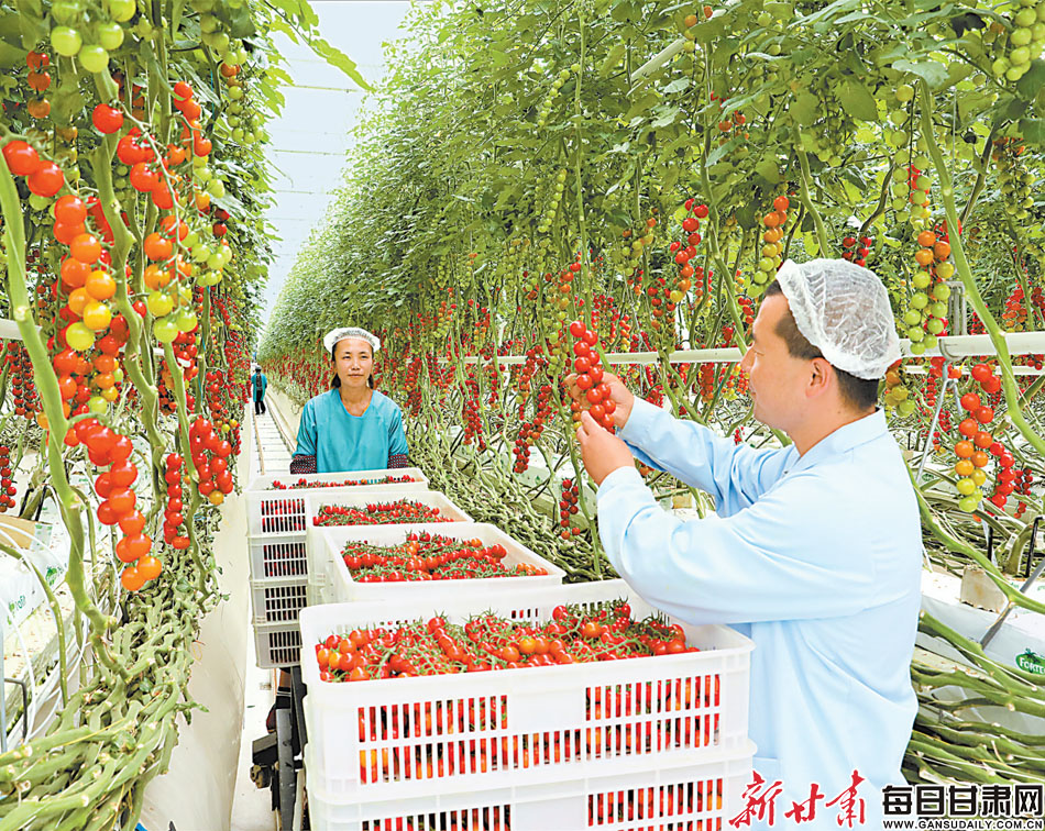 民乐县海升现代农业智能温室内,工人们正抓紧采摘新鲜时蔬。民乐县加快推进海升现代智能温室三期项目建设,着力打造百亿级现代农业产业园。新甘肃·甘肃日报通讯员尚明