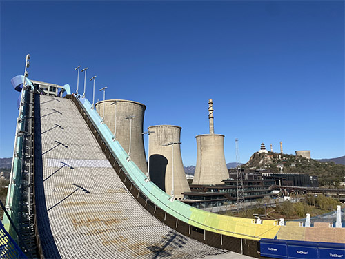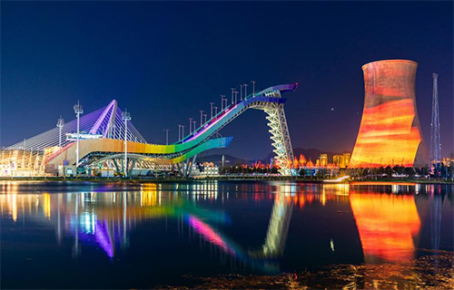 首钢滑雪大跳台位于首钢老工业园北区,场地由北向南依次分布着原首钢发电主厂房、冷却塔及原首钢制氧厂厂房。秉承着北京2022年冬奥会“可持续发展”的理念,将滑雪大跳台的地址选在首钢园区,就是充分利用大跳台周边首钢原有老厂房和工业构筑物进行修缮与改造,满足冬奥会比赛、转播、观众服务等多项功能。